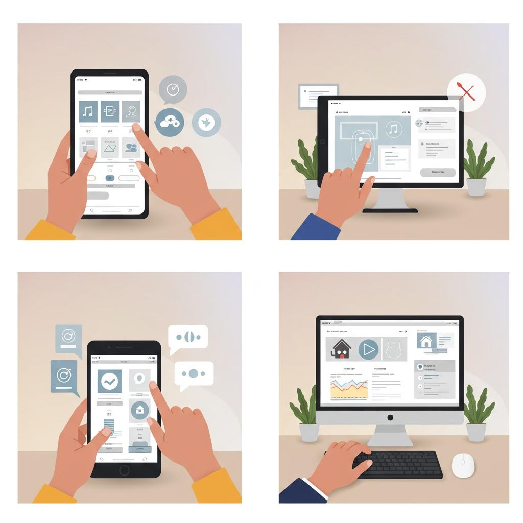 사용자 경험의 일관성은 입력 방식의 차이를 자연스럽게 수용하는 인터페이스 설계에서 완성된다. 터치 디바이스의 44px 최소 터치 영역 규칙과 데스크톱의 호버 상태 피드백을 동시에 고려한 하이브리드 접근법이 요구된다. CSS의 @media (hover: hover) 쿼리를 통해 호버 가능한 디바이스에서만 호버 효과를 활성화하고, pointer: coarse 조건으로 터치 디바이스에 최적화된 인터페이스를 제공하는 방식이다. 이러한 세밀한 구분은 각 환경에서 자연스러운 상호작용 경험을 보장한다.
